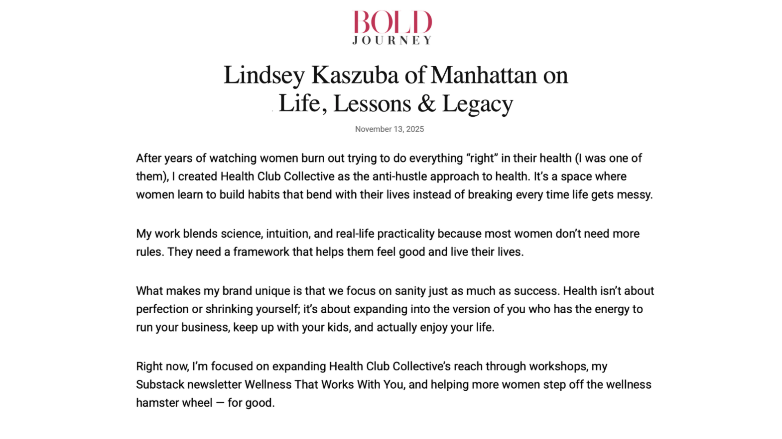 Lindsey Kaszuba of Manhattan on Life, Lessons & LegacY Nov 21 Written By Lindsey Kaszuba Read full article press featurehealth and wellnessbold journeyHealth Club Collective Lindsey Kaszuba